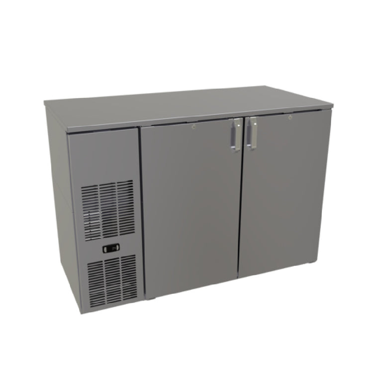 The Glastender CP1FB52 Cooler Pass-thru One Zone is a sophisticated refrigeration solution designed for efficiency and convenience in commercial settings. Measuring 52 inches in width, this two-section cooler features a 16-inch wide door opening, providing ample access to stored items. The unit is front-serviced with a bar profile design, making it an excellent choice for bar and restaurant environments where space and accessibility are crucial. It boasts a self-contained refrigeration system with LED interior lighting and front venting, ensuring both energy efficiency and ease of use. Constructed with a stainless steel interior and exterior sub-top, the cooler is durable and built to withstand frequent use in busy areas. Each section includes three adjustable shelves, offering customizable storage to meet diverse needs. Utilizing R290 Hydrocarbon refrigerant and featuring a 1/6 HP compressor, the Glastender CP1FB52 meets NSF Standard 7 for open food storage, ensuring compliance with public health standards. It holds certifications from cETLus and ETL-Sanitation, highlighting its reliability and safety in food service operations. Please note, this cooler is made to order and is not returnable, emphasizing its tailored manufacturing process to meet specific industry requirements.
