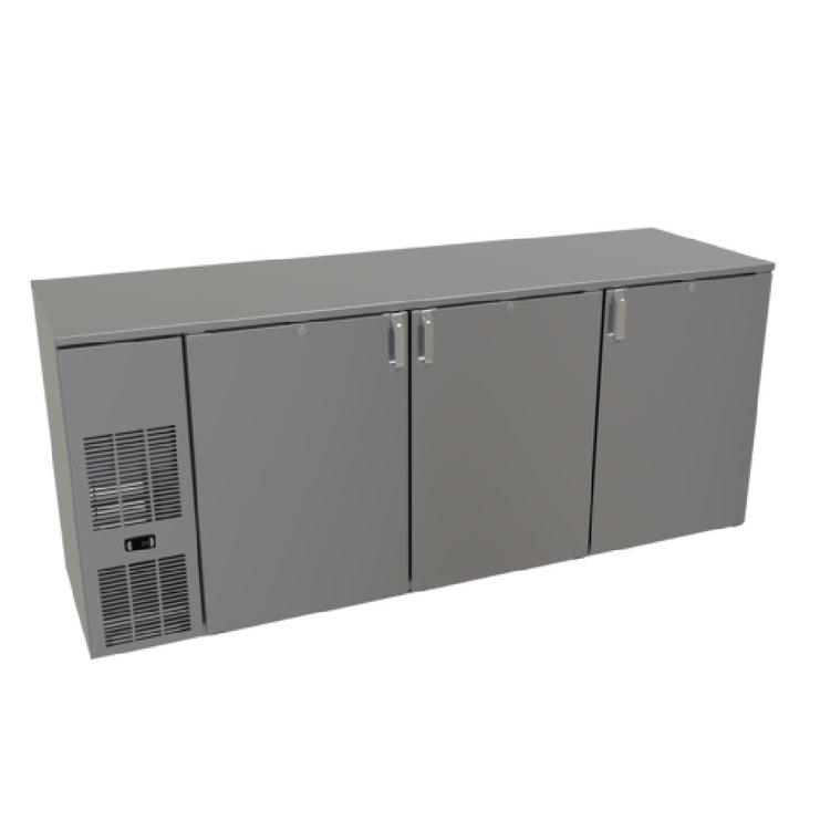 The Glastender CP1FB84 Cooler Pass-thru One Zone is a sophisticated refrigeration solution tailored for professional bar environments requiring efficient space utilization and reliable performance. This front-serviced cooler, measuring 84 inches in width, is designed with a three-section configuration, each featuring a 20-inch wide door opening for convenient accessibility. The self-contained refrigeration system incorporates R290 Hydrocarbon refrigerant, which is both environmentally friendly and efficient. With 1/4 horsepower, this unit ensures consistent cooling across its single zone. Interior LED lighting enhances visibility, while the front venting system facilitates seamless installation. The cooler's stainless steel interior and exterior sub-top emphasize durability and hygiene, ideal for high-traffic commercial settings. Each section is equipped with three adjustable shelves, offering customizable storage for various beverages and perishables. The Glastender CP1FB84 is NSF certified, ensuring compliance with safety and sanitation standards, and holds additional certifications from cETLus and ETL-Sanitation. Designed as a made-to-order product, it reflects a commitment to tailored craftsmanship in the refrigeration industry, providing a premium solution for establishments prioritizing quality and dependability. Notably, the product is non-returnable, reinforcing the bespoke nature of its manufacturing process.
