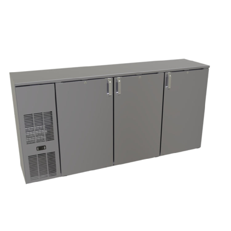 The Glastender CS1FB72 Cooler Shallow Depth One Zone is a specialized refrigeration unit engineered for bar environments requiring efficient space utilization and optimal cooling performance. Designed with a compact, shallow depth yet expansive 72-inch width, this cooler features a single-zone configuration and three-section layout for organized storage. Each 16-inch wide door opening facilitates easy access to stored items. The self-contained refrigeration system uses R290 Hydrocarbon refrigerant, supported by a 1/6 HP compressor, ensuring eco-friendly operation and energy efficiency. LED interior lighting enhances visibility, while the stainless steel interior offers durability and ease of cleaning, meeting NSF Standard 7 for open food storage. Front venting allows for versatile installation options without compromising airflow. The unit is bar-profile designed and front serviced, simplifying maintenance and integration into bar setups. Certified by cETLus and ETL-Sanitation, this cooler adheres to rigorous safety and sanitation standards. Note that this product is made to order and is non-returnable, underscoring its suitability for custom bar installations needing reliable and efficient refrigeration solutions.