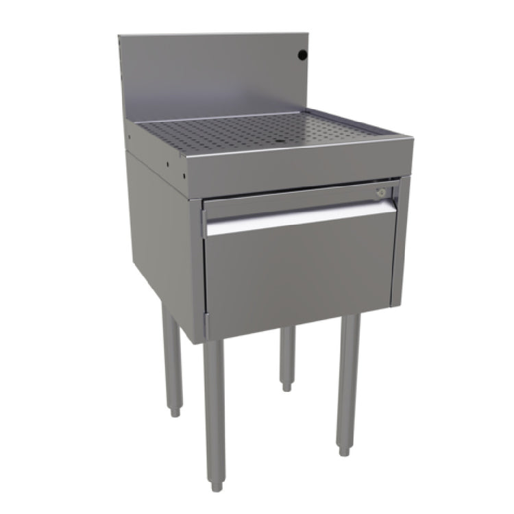 The Glastender DBHA-18 Underbar Drainboard Half Cabinet With Door 18"W x 19"D is a meticulously designed unit crafted for efficiency and durability in commercial settings. This product features an 18-inch wide by 19-inch deep drain top, complete with a perforated insert that efficiently manages liquids, making it indispensable for bars and food service environments where drainage is crucial. The hinged door comes with an integral handle and lock, providing security and ease of access to stored items. Inside, a removable bottom shelf offers flexible storage options, accommodating various operational needs. Constructed entirely from stainless steel, the cabinet ensures longevity and resistance to corrosion, ideal for the demanding conditions of a busy establishment. Its adjustable stainless steel bullet feet provide stability on uneven surfaces, enhancing safety and usability. The Glastender DBHA-18 is ETL-Sanitation certified, ensuring it meets stringent hygiene standards, a vital consideration for businesses prioritizing cleanliness. This product is made to order, emphasizing customization, although it is not returnable, underscoring the importance of ensuring it meets specific business requirements before purchase. This underbar drainboard cabinet is a functional asset, combining robust construction with practical design, tailored to meet the diverse needs of the food and beverage industry.