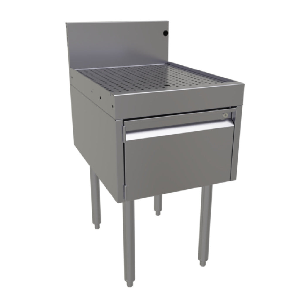 The Glastender DBHB-18 Underbar Drainboard Half Cabinet With Door is a precision-engineered unit measuring 18"W x 24"D, specifically designed to meet the diverse needs of the food and beverage industry. This specialized cabinet features a drain top with a perforated insert, offering effective drainage while ensuring cleanliness and efficiency in high-traffic workspaces. The hinged door, which includes an integral handle and lock, enhances security and accessibility, making it suitable for varied environments such as bars and restaurants. Notably, the cabinet's removable bottom shelf facilitates easy cleaning and flexible storage options, accommodating different operational requirements. Crafted from robust stainless steel, this cabinet promises durability and resistance to wear and tear, ideal for demanding commercial settings. The adjustable stainless steel bullet feet ensure stability on uneven surfaces, allowing seamless integration into any layout. The Glastender DBHB-18 is ETL-Sanitation certified, highlighting its compliance with stringent hygiene standards. As a made-to-order product, it offers tailored reliability but is non-returnable, emphasizing its bespoke nature. This cabinet represents a unique value proposition for businesses seeking a blend of practical design and dependable functionality in their underbar solutions.