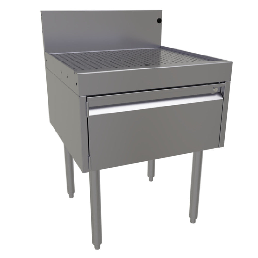 The Glastender DBHB-24 Underbar Drainboard Half Cabinet with Door, measuring 24"W x 24"D, is a versatile piece of equipment designed for efficient use in various professional environments. This unit features a drain top equipped with a perforated insert, offering functionality that is essential for bar and restaurant settings. Its hinged door is designed with an integral handle and lock, providing both security and ease of use. Inside, a removable bottom shelf offers customizable storage solutions, enhancing its practicality. Crafted entirely from stainless steel, this underbar cabinet boasts durability and resistance to corrosion, making it ideal for high-traffic areas. The adjustable stainless steel bullet feet ensure stability on uneven surfaces, further underscoring its adaptability. Certified by ETL-Sanitation, the Glastender DBHB-24 meets rigorous sanitation standards, ensuring it is suitable for food service applications. This product is made to order, emphasizing its bespoke nature, although it should be noted that it is non-returnable. The Glastender DBHB-24 serves as an indispensable addition to any commercial bar or restaurant setup, combining robust construction with practical design features tailored to meet the diverse requirements of the hospitality industry.