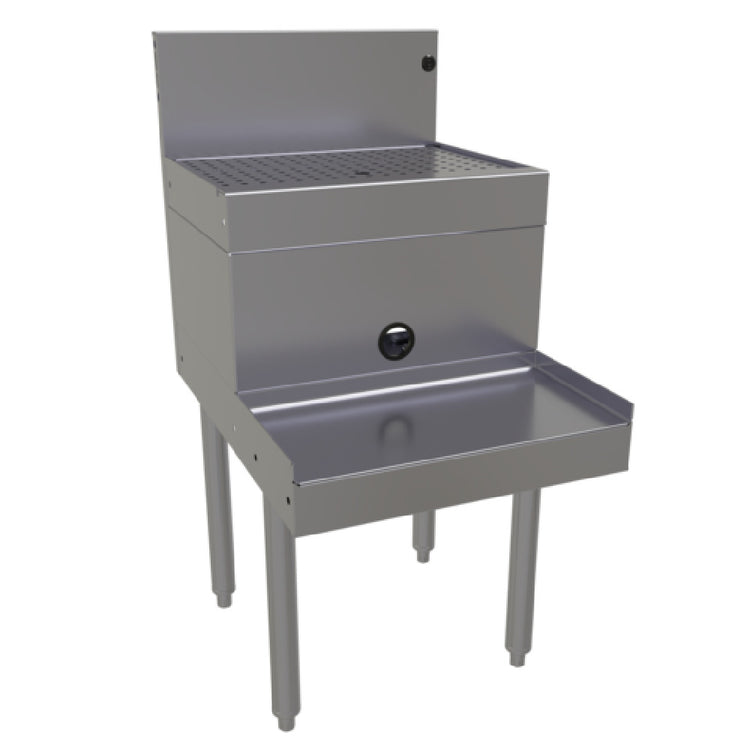 The Glastender DBSA-18 Underbar Blender Station Drainboard Top 18"W X 24"D is a highly specialized piece of equipment designed for efficient and hygienic beverage preparation in commercial settings. With dimensions of 18 inches in width and 24 inches in depth, this station is compact yet functional, ideal for optimizing underbar space in bars and restaurants. The unit features a drainboard top with a drain pan equipped with a removable perforated insert, facilitating easy cleaning and effective liquid management. A 9-inch deep blender shelf provides a dedicated space for blending tasks, enhancing workflow efficiency. Additionally, the station includes a junction box for a duplex outlet, mounted conveniently underneath the blender shelf; however, the outlet itself is not included, allowing for customizable electrical connections. Constructed entirely of stainless steel, the DBSA-18 exemplifies durability and ease of maintenance, withstanding the rigorous demands of commercial environments. The stainless steel legs come with adjustable bullet feet, ensuring stability on uneven surfaces. ETL-Sanitation certification affirms its compliance with sanitation standards, making it a reliable choice for food service operations. Please note, this product is made to order and is non-returnable, underscoring its tailored construction for specific customer requirements. This blender station uniquely combines space-saving design with robust functionality for various market segments.
