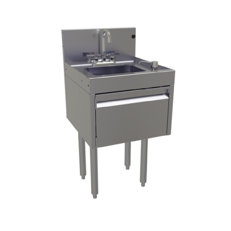 The Glastender DHSA-18 Deluxe Underbar Hand Sink Unit is a versatile and essential component for any bar or restaurant setup, providing a compact and efficient solution for hygienic handwashing needs. This free-standing unit measures 18 inches in width and 19 inches in depth, making it an ideal choice for areas with limited space. The sink features a 9-1/4 inch wide by 11-1/2 inch front-to-back by 6 inch deep bowl, ensuring ample space for hand-washing tasks. Equipped with a deck mount faucet that is low lead compliant, it promotes safety and environmental considerations. The unit also includes a convenient soap dispenser and a hinged front door that conceals a towel dispenser, aiding in maintaining a tidy and organized workspace. Constructed from durable stainless steel, this sink unit is designed for longevity and resilience in high-demand environments. The adjustable bullet feet ensure stability on uneven surfaces, enhancing its practicality. Certified by ETL-Sanitation and compliant with NSF/ANSI 61, Annex G standards, this product underscores its commitment to sanitation and safety. The Glastender DHSA-18 is a reliable, space-efficient solution that caters to the needs of various sectors within the hospitality industry, ensuring compliance and efficiency in daily operations.