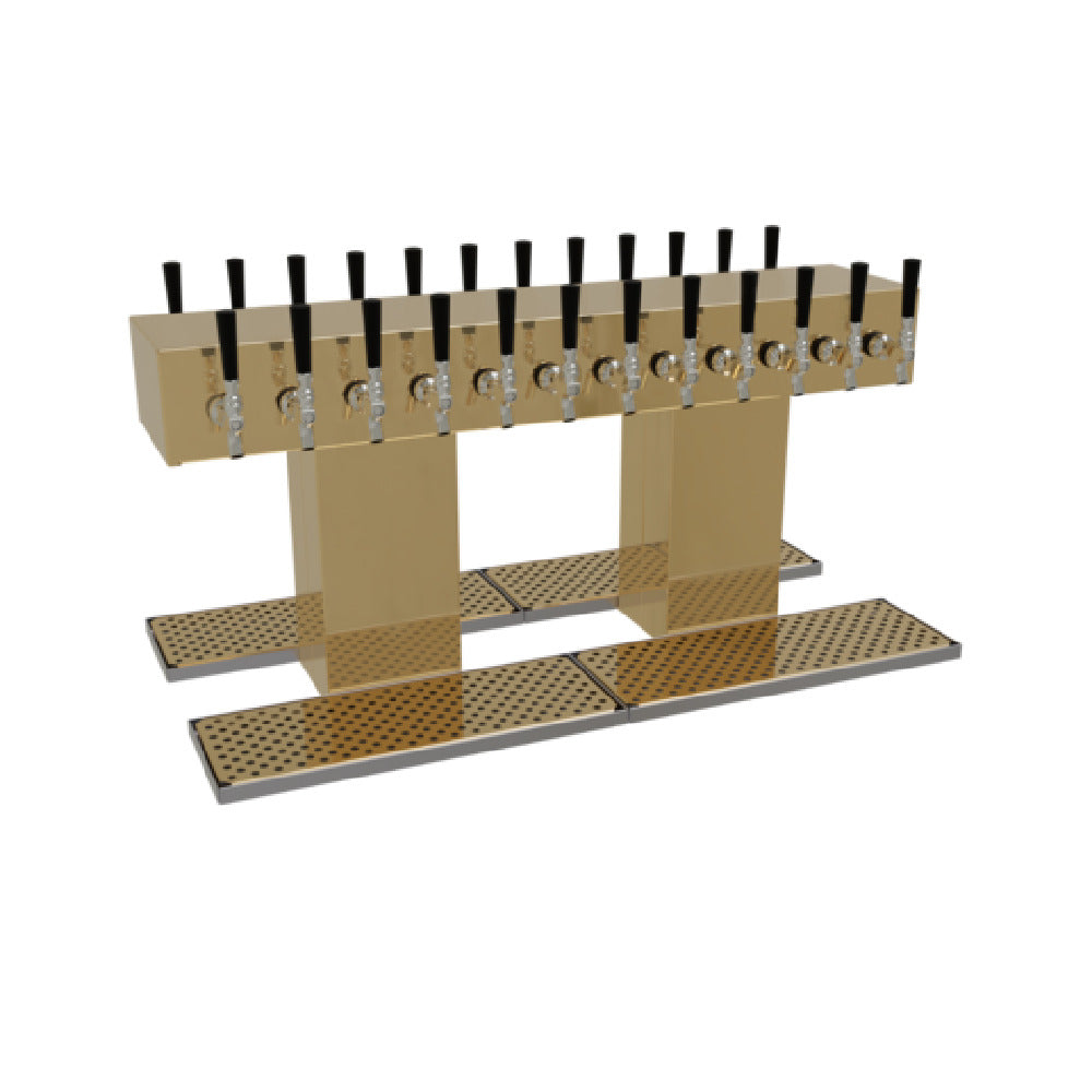 The Glastender DT-24-PBR Double-Sided Draft Dispensing Tower Countertop - a sophisticated and efficient solution for beverage service professionals - boasts (24) stainless steel faucets, providing an expansive capacity for high-volume draft dispensing. This glycol-cooled unit ensures optimal beverage temperature control, critical for maintaining the integrity and taste of the product served. It features (2) 6-3/4" W insulated columns, enhancing its cooling efficiency and ensuring a consistent draft experience. The tower is constructed with an insulated cold plate assembly, which contributes to its superior cooling capabilities. The design includes (4) mirror finish surface mount drain pans equipped with brass finish removable inserts, offering both aesthetic appeal and practicality in terms of maintenance and cleanliness. Entirely crafted from stainless steel, the tower guarantees durability and resilience in demanding environments. Its polished brass finish adds a touch of elegance, making it a striking centerpiece in any venue. Notably, this product is made to order and is non-returnable, emphasizing the bespoke nature of its construction. The Glastender DT-24-PBR is particularly suited for bars, restaurants, and catering events that require a reliable, high-capacity draft system capable of delivering beverages at the perfect temperature with style and sophistication.