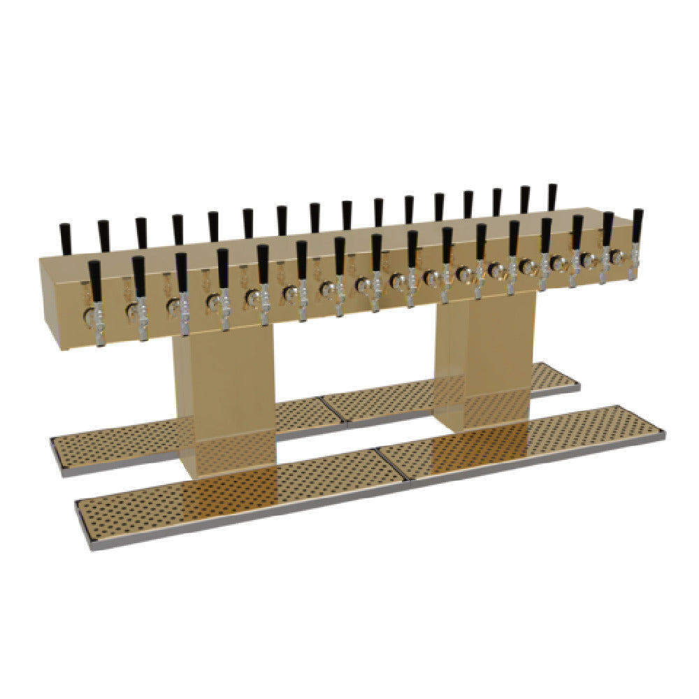 The Glastender DT-32-PBR Double-Sided Draft Dispensing Tower is a premium dispensing solution designed for establishments seeking efficiency and style. This high-capacity unit features 32 stainless steel faucets, allowing for a wide variety of beverages to be served simultaneously. Notably, the handles are not included, offering customization options to suit specific aesthetic preferences. The tower is glycol-cooled, ensuring beverages are consistently served at the optimal temperature. Its structure includes two 6-3/4" wide insulated columns, which enhance thermal efficiency. Additionally, it incorporates an insulated cold plate assembly to maintain the desired temperature for extended periods. The tower is equipped with four mirror finish surface mount drain pans, complete with brass finish removable inserts, facilitating easy cleaning and maintenance. With an all stainless steel construction and a polished brass finish, this product not only promises durability but also adds a touch of elegance to any bar or restaurant setting. Please note that this item is made to order and is not returnable, emphasizing the tailored approach to fit specific business needs. The Glastender DT-32-PBR is an excellent choice for businesses aiming to offer a diverse and high-quality beverage experience while maintaining operational efficiency.