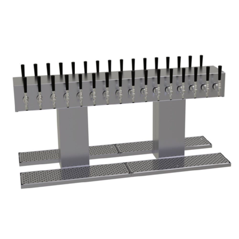 The Glastender DT-32-SSR Double-Sided Draft Dispensing Tower Countertop is an advanced dispensing solution designed for high-volume draft service environments. Featuring a total of 32 stainless steel faucets, this unit is engineered to maximize efficiency and reliability in beverage dispensing. The draft tower is glycol-cooled, ensuring consistent temperature control across all taps, which is crucial for maintaining beverage quality in various settings. It includes two 6-3/4" wide insulated columns, optimizing thermal retention for superior draft performance. The insulated cold plate assembly further enhances temperature stability, making it a standout choice for establishments prioritizing draft quality. Additionally, the design incorporates four surface mount drain pans with removable inserts, facilitating easy maintenance and cleanliness. Constructed entirely of stainless steel, the DT-32-SSR boasts a durable stainless steel finish, promising long-term durability and a sleek appearance suitable for modern bar settings. This unit is made to order, emphasizing its bespoke nature, although it is important to note that it is non-returnable. The Glastender DT-32-SSR is an exceptional choice for bars, restaurants, and event venues seeking a high-capacity, reliable draft system that combines functionality with a polished aesthetic.