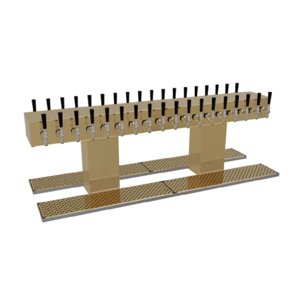 The Glastender DT-36-PBR Double-Sided Draft Dispensing Tower is a high-capacity countertop unit expertly designed for commercial beverage dispensing operations. Equipped with an impressive (36) stainless steel faucets, this tower provides substantial serving capabilities, accommodating high-volume environments with ease. The system is glycol-cooled, ensuring beverages are dispensed at optimal temperatures, which is crucial for maintaining quality and satisfaction in the bar and restaurant industry. Featuring (2) 6-3/4" wide insulated columns, the DT-36-PBR enhances temperature control and efficiency, reducing energy consumption and operational costs. Additionally, its insulated cold plate assembly further contributes to precise temperature management. The tower includes (4) mirror finish surface mount drain pans with removable brass finish inserts, which not only facilitate ease of cleaning and maintenance but also add a touch of elegance to the overall aesthetic. Constructed entirely from stainless steel, the unit promises durability and resistance to corrosion, making it a reliable choice for long-term use. The polished brass finish adds a sophisticated visual appeal, suitable for upscale venues seeking to combine functionality with style. Note that the product is made to order and is non-returnable, emphasizing the importance of precise specifications prior to purchase.