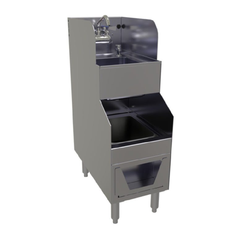 The Glastender FS12 Underbar Hand & Wet Waste Sink is a meticulously designed unit tailored for efficient use in various hospitality and food service settings. Measuring 12 inches wide by 24 inches deep, this sink setup includes two distinct bowl areas, each measuring 9-1/4 inches in width, 11-1/2 inches front-to-back, and 6 inches deep, optimizing it for both handwashing and waste management. The upper bowl functions as a hand sink, while the lower bowl effectively handles wet waste, making it suitable for high-demand environments. It features back and side splashes to minimize water spillage and maintain cleanliness. The unit is equipped with a splash mount faucet set on 4-inch centers, complying with low-lead standards to meet health and safety regulations. Additional conveniences include a lift-out plastic perforated sink strainer, a built-in soap dispenser, and a front-flush C-fold paper towel dispenser, all enhancing the sink’s functionality. Constructed from durable stainless steel with legs featuring adjustable bullet feet, this sink ensures stability and longevity. The Glastender FS12 is ETL-Sanitation certified, underscoring its adherence to stringent sanitation standards, making it an invaluable asset for bars, restaurants, and cafes seeking reliability and efficiency in their underbar installations.