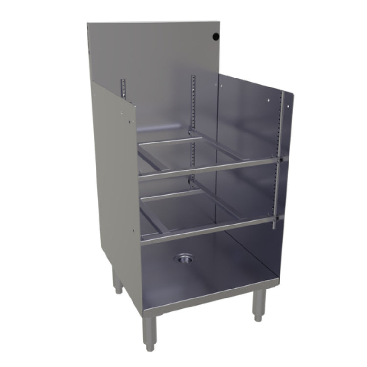 The Glastender GRA-18 Underbar Glass Rack Storage Unit is a meticulously designed piece of equipment tailored for efficient glassware management in commercial settings. With dimensions of 18 inches in width and 19 inches in depth, this open-top storage unit is engineered to hold up to three glass racks with a 16-inch diameter each. It features an open front base for easy access and is equipped with two adjustable glass rack slides, ensuring flexibility and convenience in accommodating various rack sizes. The inclusion of pilasters and clips further enhances its adaptability. A key technical feature of the GRA-18 is the 1-1/2 inch I.P.S. threaded drain located in the bottom shelf, facilitating efficient drainage and maintenance. Constructed from durable stainless steel, the unit boasts not only a sleek appearance but also exceptional longevity and resistance to corrosion. The stainless steel legs are finished with adjustable stainless steel bullet feet, offering stability and customizable height to suit different underbar configurations. Certified by ETL-Sanitation, this unit meets stringent sanitation standards, making it an indispensable asset for bars, restaurants, and other establishments that require reliable and hygienic glass rack storage solutions. Note that this product is made to order and is non-returnable, ensuring a bespoke fit for your specific needs.