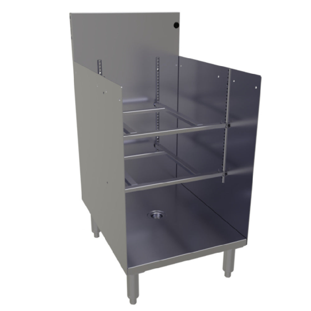 The Glastender GRB-18 Underbar Glass Rack Storage Unit is an essential fixture designed to optimize space and organization in bar and restaurant settings. With dimensions measuring 18 inches in width and 24 inches in depth, this unit is expertly crafted to accommodate three 16-inch diameter glass racks, making it ideal for establishments with high glassware turnover. The open top and open front base design facilitate easy access and efficient workflow. It includes two adjustable glass rack slides, providing flexibility to meet varying storage needs. The unit is further equipped with pilasters and clips for enhanced stability. The bottom shelf features a 1-1/2 inch I.P.S. threaded drain, effectively managing liquid runoff and maintaining a hygienic environment. Constructed from durable stainless steel, the Glastender GRB-18 ensures longevity and resistance to corrosion, while its stainless steel legs with adjustable bullet feet offer stability on uneven surfaces. This product is ETL-Sanitation certified, ensuring it meets rigorous sanitation standards. Please note, as a made-to-order item, it is non-returnable, underscoring its bespoke nature for tailored storage solutions in professional hospitality environments.