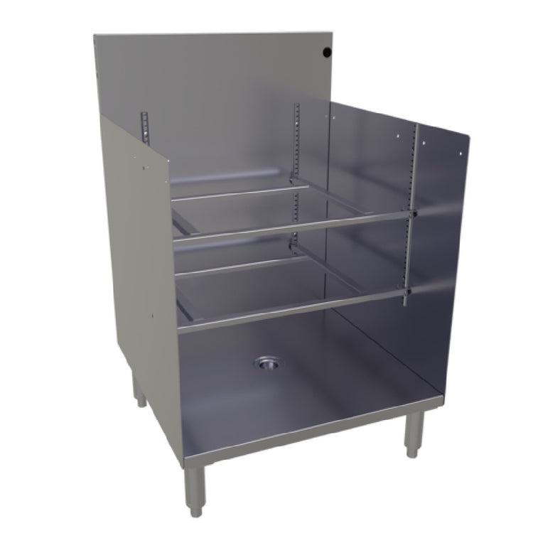 The Glastender GRB-24 Underbar Glass Rack Storage Unit is an efficient and versatile storage solution for various segments within the bar and restaurant industry. Measuring 24 inches in width and 24 inches in depth, this open-top unit is designed to neatly house up to three 20-inch by 20-inch glass racks, making it an ideal choice for establishments with diverse glassware storage needs. Featuring an open front base and two adjustable glass rack slides, it provides customizable storage configurations to accommodate varying glass rack sizes. The inclusion of pilasters and clips facilitates secure rack placement. A key feature of this unit is the 1-1/2 inch I.P.S. threaded drain located in the bottom shelf, promoting effective drainage and ease of maintenance. Crafted from high-quality stainless steel, both the construction and legs of the unit ensure durability and longevity, with the adjustable stainless steel bullet feet allowing for stability and height customization on uneven surfaces. This product is ETL-Sanitation certified, affirming its adherence to rigorous sanitation standards. It is important to note that the Glastender GRB-24 is made to order and is not returnable, reflecting its bespoke manufacturing process tailored to specific customer requirements.