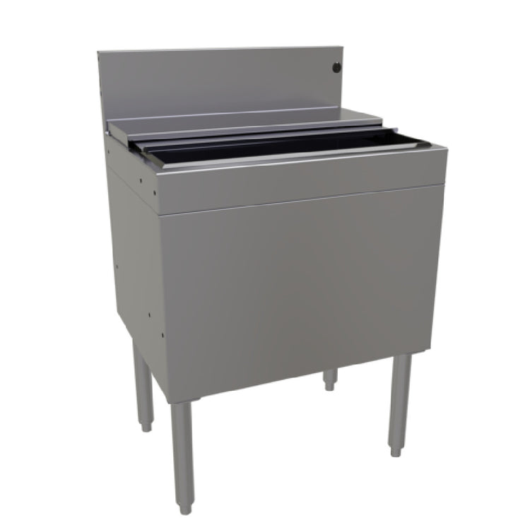 The Glastender IBA-24-ED Extra Deep Underbar Ice Bin is an essential solution for any professional bar setting, offering an impressive ice capacity of 92 lbs. Its dimensions of 24"W x 19"D and a bin liner depth of 14-1/2" make it an optimal choice for managing substantial ice needs efficiently. The ice bin features a robust PVC breaker strip around the liner, enhancing durability and ease of use. Constructed entirely of stainless steel, the unit is built to withstand the rigorous demands of a busy bar environment. The inclusion of a sliding stainless steel bin cover ensures the ice remains clean and accessible. Its stainless steel legs are equipped with adjustable bullet feet, providing stability and adaptability on uneven surfaces, crucial for maintaining efficiency and safety in dynamic workspaces. Certified with ETL-Sanitation, the Glastender IBA-24-ED emphasizes compliance with sanitation standards, making it suitable for a wide range of food and beverage service environments. As a made-to-order product, it is tailored to meet specific operational needs, although it is non-returnable. This underbar ice bin is a smart investment for bars, restaurants, and hospitality venues seeking a reliable and spacious ice storage solution.