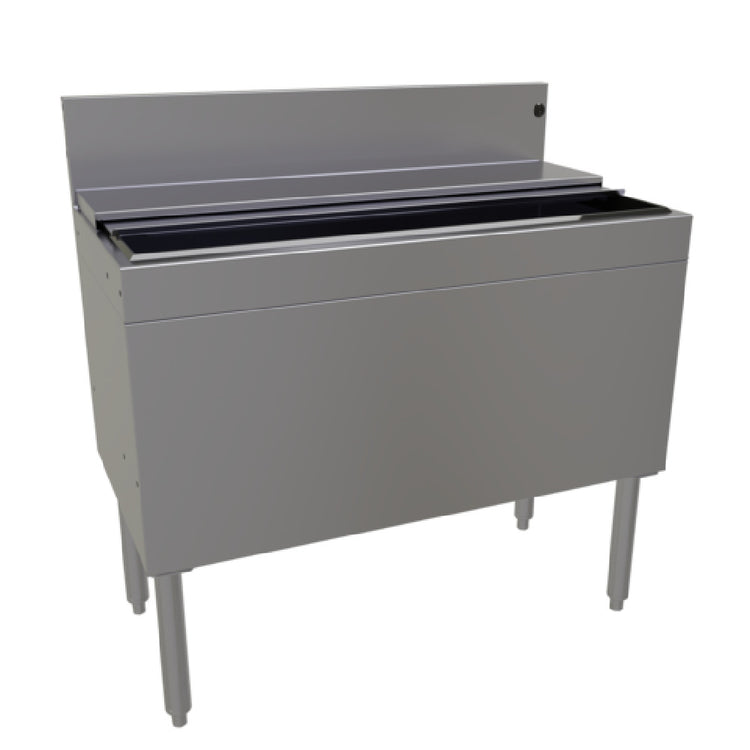The Glastender IBA-36-CP10-ED Extra Deep Underbar Ice Bin With 10-circuit Cold Plate is a meticulously designed product ideal for various segments within the beverage and hospitality industry. This ice bin features a 36-inch width and a 19-inch depth, accommodating a substantial ice capacity of 139 pounds, perfectly suited for high-demand environments. Its 14-1/2 inch deep bin liner is enclosed by a PVC breaker strip, ensuring durability and efficiency in maintaining ice temperature. The inclusion of a 10-circuit cold plate distinguishes this model by facilitating rapid cooling, enhancing service speed and quality. This product is constructed entirely from stainless steel, offering resilience and longevity, with additional features such as sliding stainless steel bin cover and stainless steel legs with adjustable stainless steel bullet feet, ensuring stability on various surfaces. The Glastender IBA-36-CP10-ED is ETL-Sanitation certified, confirming its adherence to industry hygiene standards. Please note that this product is made to order and is non-returnable, emphasizing its bespoke manufacturing process tailored to meet specific operational needs. This ice bin is a reliable and efficient solution for establishments seeking to enhance their bar service capabilities with a high-performing, durable unit.