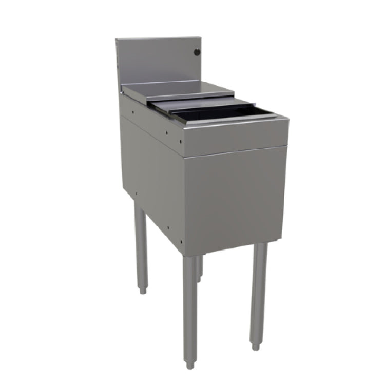 The Glastender IBB-12 Underbar Ice Bin is a compact yet high-capacity solution tailored for efficient ice storage needs in the hospitality and service industries. Measuring 12 inches in width by 24 inches in depth, this ice bin accommodates up to 42 pounds of ice, strategically designed for space-constrained environments. The bin features a 10-1/2 inch deep liner, ensuring substantial storage while maintaining a sleek profile. Encased in durable stainless steel, it provides longevity and resistance to corrosion, crucial for high-usage commercial settings. The inclusion of a PVC breaker strip around the ice bin liner enhances its structural integrity, preventing leaks and maintaining temperature efficiency. A sliding stainless steel bin cover offers protection against contaminants, adding a layer of hygiene to its sanitation-focused design. Supported by stainless steel legs with adjustable bullet feet, the bin ensures stability and facilitates easy leveling on uneven surfaces. Certified by ETL-Sanitation, this underbar ice bin adheres to stringent sanitation standards, making it an ideal choice for bars, restaurants, and other service areas that prioritize cleanliness and durability. Note that this item is made to order and is non-returnable, emphasizing the importance of careful consideration in the purchasing process for bespoke applications.