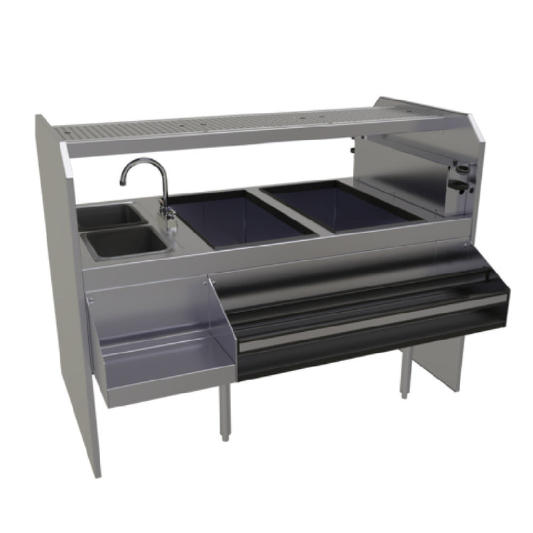 The Glastender PSA-60L Assembly Style Pass-Thru Cocktail Station is a meticulously designed unit measuring 60"W x 32"D, tailored for an efficient leftward workflow. This station is ideal for high-paced bar environments, featuring two pass-thru ice bins that ensure easy access and efficient drink preparation. The unit is equipped with two wet waste sinks, complemented by a single gooseneck faucet that is low lead compliant, enhancing both safety and usability. Strainers are included, promoting easy maintenance and cleanliness. Additionally, the station boasts liquor bottle storage, optimizing organization and accessibility. A 15"D stainless steel draining shelf, complete with removable perforated inserts, provides ample space for drying and organizing bar tools. The Glastender PSA-60L is ETL-Sanitation certified, affirming its adherence to rigorous sanitation standards. As this product is made to order, it is crafted to meet specific needs and preferences, although it is non-returnable, emphasizing the importance of precision in its initial selection and customization. Tailored for the hospitality industry, this cocktail station combines functionality with compliance, making it a valuable asset for any commercial bar seeking streamlined operations and enhanced service efficiency.