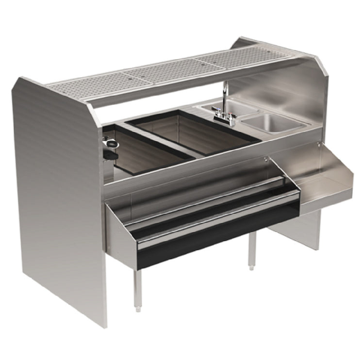 The Glastender PSA-60R Assembly Style Pass-Thru Cocktail Station is meticulously engineered for efficient bar operations, featuring a 60"W x 32"D layout with a rightward workflow. This cocktail station is designed to streamline service with its dual pass-thru ice bins and two wet waste sinks, each equipped with strainers and serviced by a single gooseneck faucet that is low lead compliant, ensuring safe, high-quality water delivery. Liquor bottle storage is integrated into the design for easy access, enhancing the bartender's efficiency. To support quick and sanitary operations, the unit includes a 15"D stainless steel draining shelf fitted with removable perforated inserts, facilitating effortless cleaning and maintenance. The PSA-60R is ETL-Sanitation certified, denoting its adherence to stringent health and safety standards, making it an indispensable asset for bars and cocktail lounges prioritizing hygiene and workflow optimization. Crafted for industry professionals, this station is built to order, reflecting a commitment to quality and customization, although it is non-returnable. This innovative cocktail station combines practical features with robust construction, making it an ideal solution for enhancing service speed and organization in high-volume bar environments.