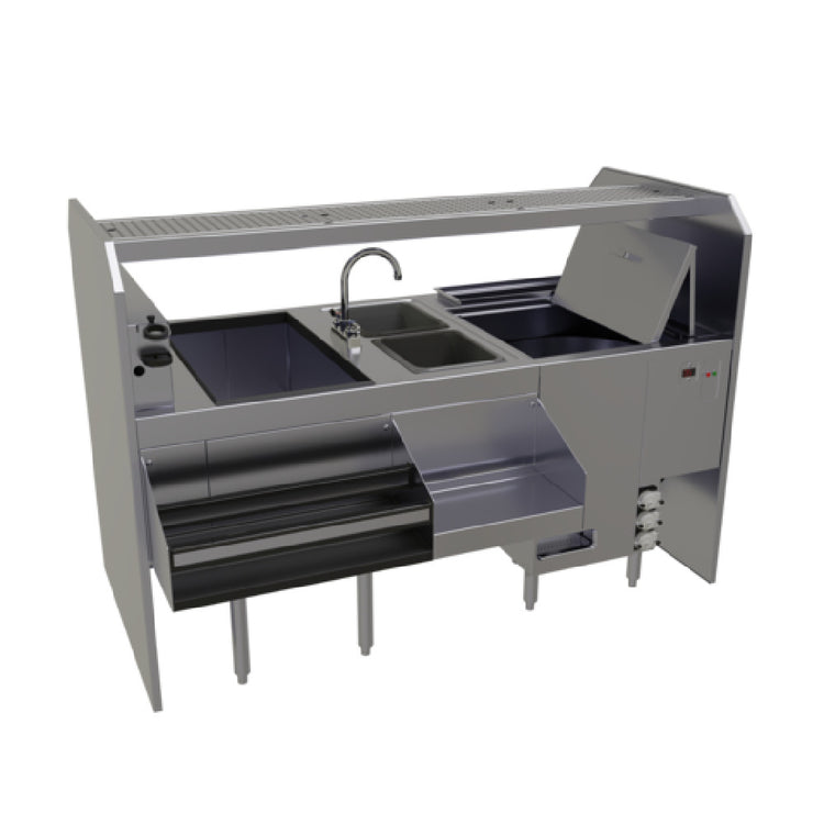 The Glastender PSC-66R Complete Style Pass-Thru Cocktail Station With Glasswasher 66"W X 32"D is a meticulously crafted unit designed for high-efficiency cocktail preparation in professional hospitality settings. This pass-thru station features a unique rightward workflow, facilitating seamless operations behind the bar. Central to its design is the GW24 automatic rotary glass washer with a bifold cover, ensuring rapid and hygienic cleaning of glassware. The station is equipped with two wet waste sinks, each featuring a low lead compliant gooseneck faucet and strainers, which are essential for maintaining cleanliness and compliance with health standards. Additionally, the integrated pass-thru ice bin and liquor bottle storage streamline drink preparation and service. A dry waste receptacle is included for convenient waste management. The cocktail station also includes a 12"D stainless steel draining shelf with removable perforated inserts, allowing for easy cleaning and maintenance. This unit is ETL-Sanitation certified, providing assurance of its adherence to sanitation standards. A notable feature of this product is the one-year parts and labor warranty on the glasswasher. Made to order and non-returnable, the Glastender PSC-66R is a specialized solution for bars and restaurants prioritizing efficiency and hygiene in their operations.