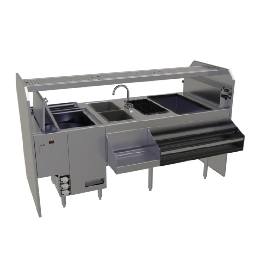 The Glastender PSC-78L Complete Style Pass-Thru Cocktail Station With Glasswasher is a meticulously crafted unit, designed to elevate efficiency in cocktail preparation environments. With dimensions of 78"W x 32"D, it features a leftward workflow to streamline operations. Central to its functionality is the GW24 automatic rotary glass washer, complete with a bifold cover, ensuring swift and thorough cleaning of glassware. This station incorporates two wet waste sinks equipped with a gooseneck faucet, compliant with low-lead standards, and practical strainers. Enhancing its versatility, the pass-thru ice bin ensures quick access to ice, while the 8-bottle insulated storage well maintains optimal temperatures for beverage ingredients. Liquor bottle storage is seamlessly integrated for easy access, complemented by a designated dry waste receptacle. The 12"D stainless steel draining shelf, featuring removable perforated inserts, provides a durable workspace. Its ETL-Sanitation certification guarantees adherence to sanitation standards, and a one-year parts and labor warranty on the glasswasher underscores Glastender's commitment to quality. Crafted as a made-to-order unit, this cocktail station is non-returnable, embodying a bespoke solution for diverse market segments within the hospitality industry, from high-paced bars to refined cocktail lounges.