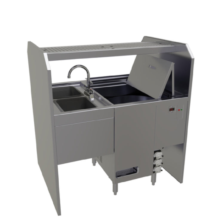 The Glastender PSD-42R Disassembly Style Pass-Thru Cocktail Station With Glasswasher is a meticulously designed unit tailored for efficient cocktail preparation and cleaning processes in high-demand environments such as bars, restaurants, and hotels. Measuring 42 inches in width and 32 inches in depth, this station is engineered with a rightward workflow to optimize space usage and streamline operations. Central to its functionality is the GW24 automatic rotary glass washer, which comes with a bifold cover, ensuring swift and thorough cleaning of glassware. The station is equipped with two wet waste sinks, each featuring strainers and a gooseneck faucet that is low lead compliant, promoting sustainability and health safety. For waste management, it includes a dry waste receptacle, while a 12-inch deep stainless steel draining tray shelf with removable perforated inserts facilitates efficient drying of glassware and utensils. The Glastender PSD-42R is ETL-Sanitation certified, guaranteeing adherence to stringent sanitation standards. A notable highlight is its one-year parts and labor warranty on the glasswasher, providing additional assurance of its durability and reliability. This product is made to order, reflecting its bespoke nature and commitment to tailored solutions, although it is non-returnable due to its personalized construction.