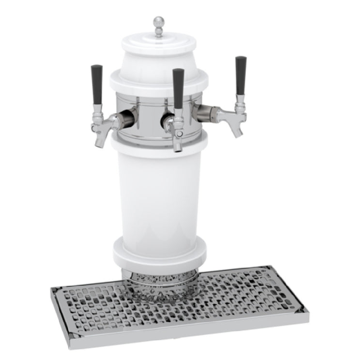 The Glastender RBT-3-MFR Roman Draft Dispensing Tower is a specialized beverage dispensing solution featuring three stainless steel faucets, though handles are not included, ideal for a variety of commercial settings. This tower is constructed from durable ceramic, ensuring longevity and reliability, with a striking mirror finish that adds a touch of elegance to any bar setup. Its technical design includes an insulated copper glycol loop, which is essential for maintaining the optimal temperature of beverages, ensuring a refreshing pour every time. The unit also features insulated restriction lines, which contribute to efficient and consistent beverage flow, minimizing waste and maximizing efficiency. A key component of the Glastender RBT-3-MFR is the mirror finish surface mount drain pan, complete with a removable perforated insert, allowing for easy cleaning and maintenance. The product is made to order, reflecting its customizable nature to suit specific client needs, and it is not returnable, underscoring its bespoke manufacturing process. This dispensing tower is well-suited for upscale bars, restaurants, and breweries looking to enhance their beverage service capabilities with a reliable, aesthetically pleasing draft system that meets the demands of a professional environment.
