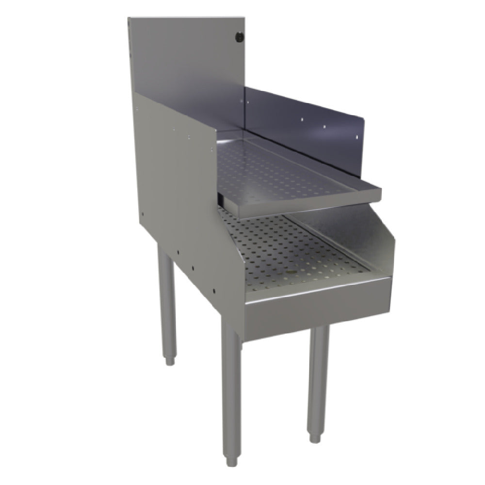 The Glastender RDBB-12S Recessed Drainboard is a versatile, free-standing unit designed for optimal functionality and durability in commercial settings. Measuring 12 inches in width and 29 inches in depth, it seamlessly matches 24-inch deep units with a single speed rail, ensuring a cohesive and efficient bar setup. This model features a drip pan with a perforated insert and a lift-out perforated shelf, particularly useful for handling glassware with ease. Crafted from high-quality stainless steel, the RDBB-12S promises long-lasting performance and resistance to corrosion, making it an ideal choice for busy bars and restaurants. The adjustable stainless steel bullet feet provide stability on uneven surfaces, enhancing the unit's versatility in various environments. The Glastender RDBB-12S is ETL-Sanitation certified, attesting to its adherence to strict sanitation standards, crucial for maintaining hygiene in any food and beverage establishment. Please note that as a made-to-order item, it is not returnable, which underscores the importance of precise planning during the ordering process. This product is particularly valuable in settings that demand efficient glassware handling and drainage solutions, providing both practical and aesthetic benefits to enhance overall bar operations.