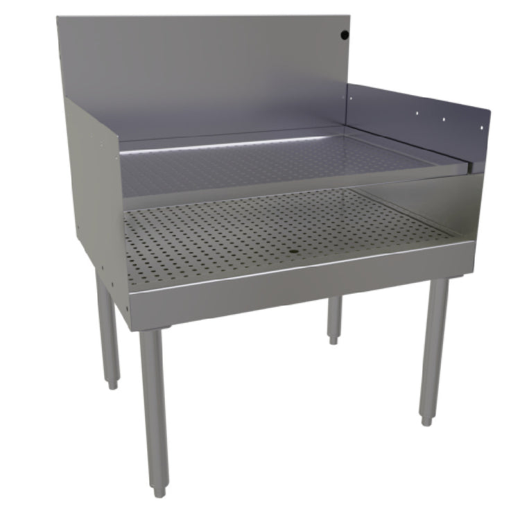 The Glastender RDBB-30 Recessed Drainboard Free Standing 30"W x 24"D is an expertly engineered product designed for seamless integration with 24" deep units, excluding speed rails. This durable drainboard features a drip pan equipped with a perforated insert, efficiently capturing excess liquid and ensuring a clean work environment. Its lift-out perforated shelf is specifically designed for glassware, providing an organized and accessible storage solution, which is crucial for bartending stations and food service operations. Constructed entirely from robust stainless steel, the RDBB-30 promises longevity and resistance to corrosion, meeting the rigorous demands of high-traffic commercial settings. Additionally, it is fitted with adjustable stainless steel bullet feet, allowing for stable placement on uneven surfaces. The product is ETL-Sanitation certified, underscoring its compliance with stringent health and safety standards. It is important to note that this product is made to order and is non-returnable, highlighting its customized manufacturing process tailored to specific industry needs. Whether in busy bars, restaurants, or hospitality venues, the Glastender RDBB-30 Recessed Drainboard stands out as a practical and reliable choice for professionals seeking high-quality, specialized equipment.