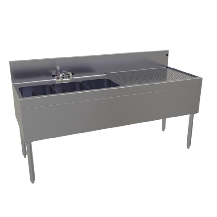 The Glastender TSB-66L-S Underbar Sink Unit Three Compartment is a meticulously engineered underbar sink solution designed for professional settings. Measuring 66 inches in width and 24 inches in depth, this unit provides ample working space, accommodating diverse operational needs within the hospitality industry. The sink unit features three sink compartments, each measuring 11 inches wide, 14 inches front-to-back, and 10-1/4 inches deep, offering substantial capacity for efficient cleaning and preparation tasks. A 30-inch drainboard is conveniently positioned on the right side, complete with a removable perforated insert for streamlined operations. This unit includes a deck mount faucet that is low lead compliant, ensuring safety and adherence to regulatory standards. Three overflow standpipes are provided, enhancing the unit's functionality and preventing overflows during intensive use. Constructed entirely from stainless steel, it features stainless steel legs with adjustable bullet feet, ensuring durability and stability. The Glastender TSB-66L-S is ETL-Sanitation certified, guaranteeing compliance with stringent sanitation requirements. It is a made-to-order product, highlighting its customization and exclusivity, thus not returnable. This underbar sink unit is ideal for bars, restaurants, and catering services, providing reliable and efficient performance tailored to high-demand environments.