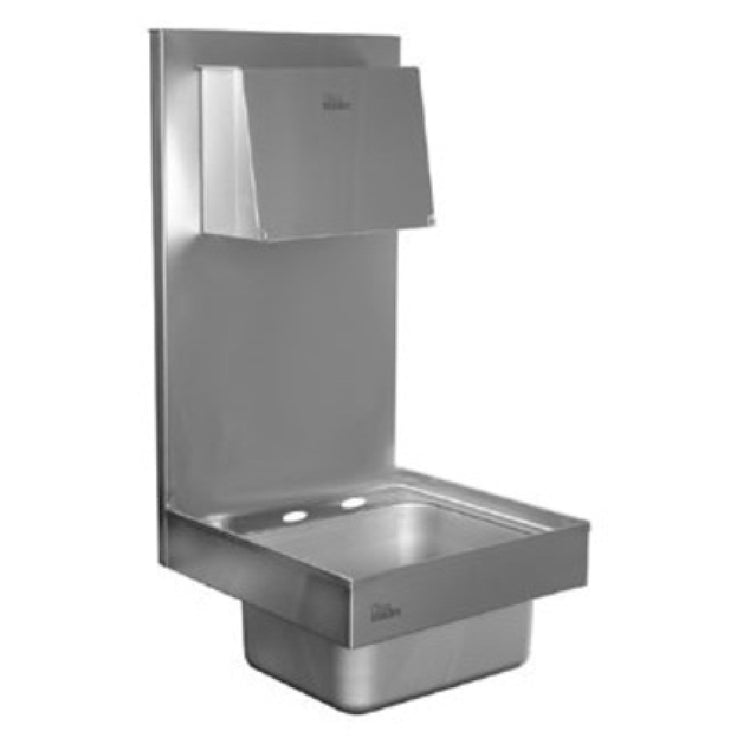 The Glastender WH-14-ESD-LF hand sink wall mount 14"W x 15"D OA is a versatile fixture designed for efficient and hygienic handwashing in various professional settings. Featuring a compact 14-inch wide and 15-inch deep overall size, this hand sink is perfect for environments with limited space. It includes a 22-inch high backsplash to protect walls from water splashes, and its 9-1/4-inch wide by 11-1/2-inch front-to-back by 6-inch deep bowl provides ample space for handwashing tasks. The sink is equipped with 4-inch OC deck mount faucet holes, though the faucet is not included, allowing for customization based on specific needs. A 1-inch recessed work surface offers additional utility and prevents water overflow. The unit includes both a soap and towel dispenser, enhancing convenience and hygiene management. Constructed from durable stainless steel, it ensures longevity and easy maintenance. With an included mounting bracket and a 1-1/2-inch I.P.S. drain fitting, installation is straightforward. The Glastender WH-14-ESD-LF is ETL-Sanitation certified, ensuring it meets high sanitation standards, making it an excellent choice for restaurants, healthcare facilities, and other businesses prioritizing cleanliness and efficiency. Note: This product is made to order and is not returnable, reflecting its tailored design for specific client needs.