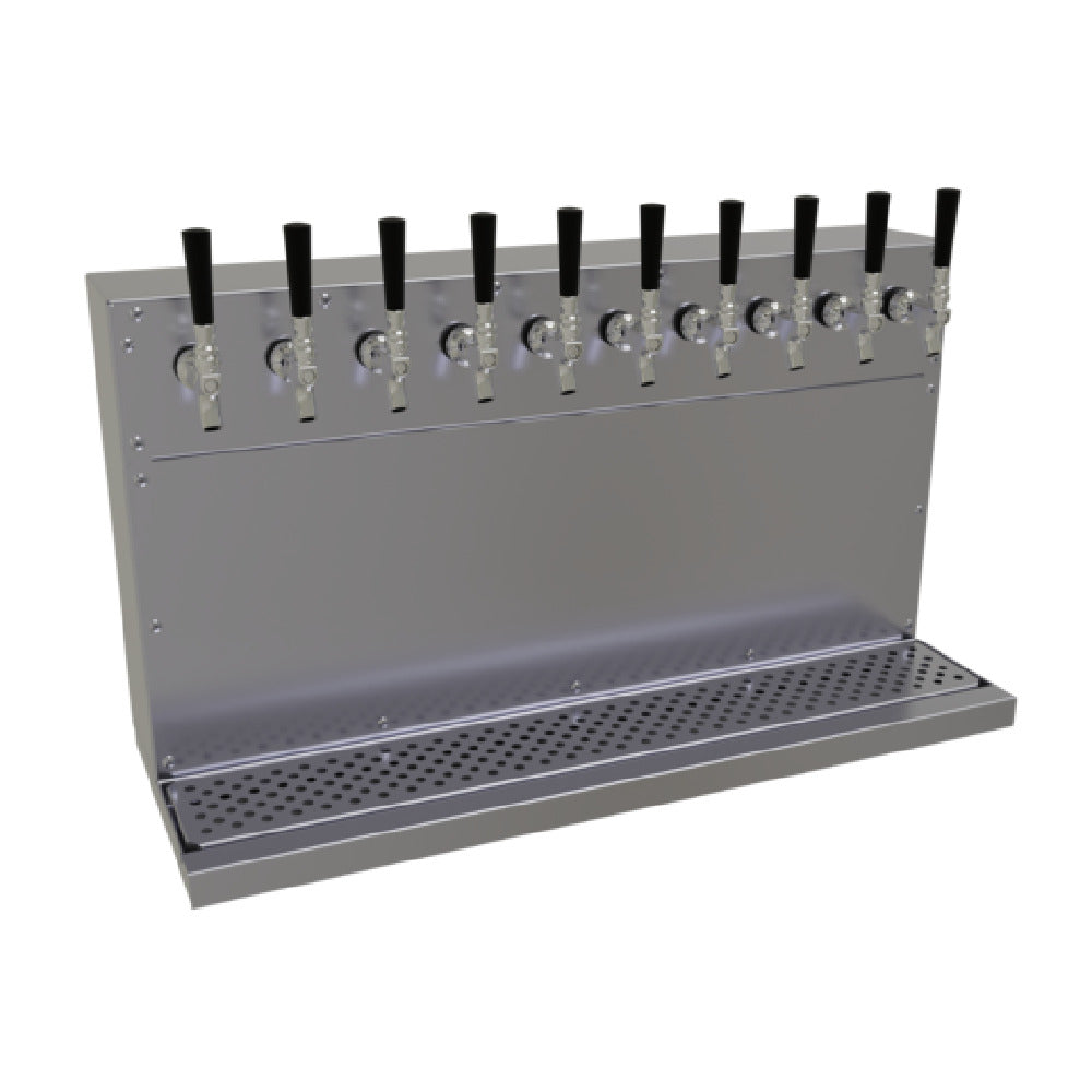 The Glastender WT-10-SS Draft Dispensing Tower is a wall-mounted unit measuring 32"W x 16"H, designed to efficiently serve beverages in commercial settings. This air-cooled draft tower is equipped with ten stainless steel faucets, although handles are not included, providing versatility in dispensing multiple beverages. The unit features an 11-1/4" faucet clearance to accommodate a range of glass sizes. For ease of maintenance and cleanliness, it includes an integral drain pan with a removable perforated insert and a 1/2" tailpiece. The draft tower's 1/4" stainless steel shanks are accompanied by 3/16" restriction lines, ensuring optimal beverage flow and temperature control. Its built-in mounting bracket facilitates secure installation, while the removable front cover allows for straightforward access during cleaning or service. Constructed entirely from stainless steel, the tower promises durability and longevity, making it a reliable choice for bars, restaurants, and other beverage dispensing applications. The Glastender WT-10-SS is ETL-Sanitation certified, adhering to high standards of hygiene and safety. Please note that this product is made to order and is non-returnable, emphasizing the importance of ensuring it meets specific requirements before purchase.