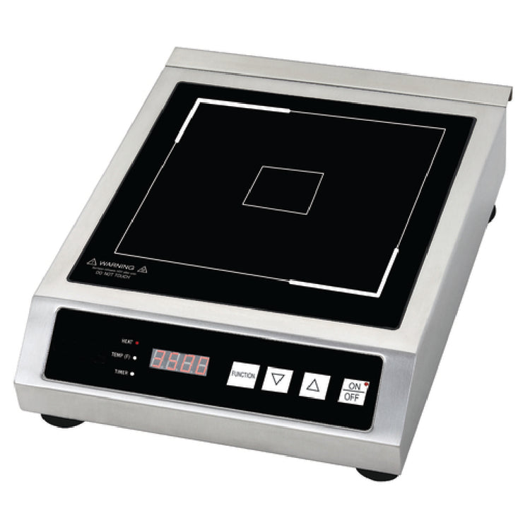 Global Solutions By Nemco GS1680 Induction Range Countertop 10" Dia. Pan Maximum is a versatile and portable cooking appliance designed to meet the diverse needs of the culinary industry. This countertop induction range accommodates pans up to 10 inches in diameter, making it suitable for various cooking environments. The cooktop features a durable glass surface, operated via intuitive touch pad controls and a user-friendly 4-digit LED display. It offers a digital timer for precise cooking and seven power levels to tailor the cooking process to specific recipes. With temperature settings ranging from 140°F to 460°F, it provides a wide spectrum of culinary possibilities. The appliance also includes critical safety features such as pan detection, automatic safety shut-off, and overheat protection, ensuring safe operation in busy kitchens. Error code alerts facilitate quick troubleshooting. Constructed from heavy-duty stainless steel, it promises durability and reliability. The GS1680 operates at 120 volts, with an 1800-watt power output, and draws 15 amps, compatible with NEMA 5-15P outlets. It is ETL certified, indicating compliance with safety standards. This induction range is an ideal choice for professional chefs and caterers seeking efficiency, safety, and versatility in their cooking equipment.