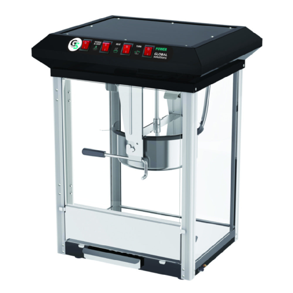 The Global Solutions By Nemco GS1735 Popcorn Popper is a high-performance appliance featuring a 6-ounce capacity stainless steel kettle, making it suitable for small to medium-scale commercial environments such as movie theaters, concession stands, and event venues. Engineered with tempered glass sides, this popcorn popper not only allows for clear visibility of the popping process but also ensures durability and resistance to shattering, which enhances safety and longevity. The unit is constructed with an aluminum frame, which combines lightweight properties with remarkable sturdiness, offering a reliable structure that is easy to transport and maintain. The removable crumb tray is a practical addition, facilitating effortless cleaning and contributing to the machine's hygiene standards. Operating at 120 volts and drawing 10.2 amps, the GS1735 delivers 1175 watts of power, ensuring quick and efficient popping cycles. The popper is furnished with a NEMA 5-15P plug, ensuring compatibility with standard electrical outlets, and carries cETLus and ETL-Sanitation certifications, affirming its adherence to stringent safety and sanitation standards. This popcorn popper exemplifies a seamless blend of functionality and convenience, making it an optimal choice for businesses seeking a reliable, efficient, and easy-to-clean popcorn machine within the food service industry.
