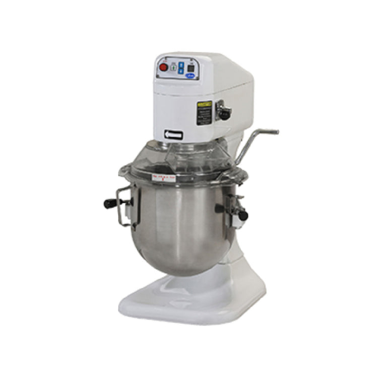The Globe SP08 (QUICK SHIP) Planetary Mixer 8 Qt. Countertop Model is an efficient and versatile tool designed for professional kitchens, bakeries, and small food production facilities. With a robust 8-quart capacity, it caters to diverse mixing needs, supported by a 3-speed fixed gear-driven transmission that ensures consistent performance. The mixer is equipped with front-mounted touchpad controls and a 15-minute digital timer, enhancing precision in mixing tasks. A safety interlocked bowl lift provides added security during operation, while the thermal overload protection ensures the mixer's longevity and reliability. Included with the mixer are a polycarbonate bowl guard with a chute for safe and easy ingredient addition, a stainless steel bowl and whip for durability, an aluminum beater, and a spiral dough hook. The mixer's cast aluminum body is powered by a 1/4 HP motor with a 115v/60/1-ph electrical specification, drawing 5.0 amps through a NEMA 5-15P plug. Certified by NSF and cETLus, this model guarantees adherence to high safety and sanitation standards. Its compact countertop design allows for efficient use of space, making it an ideal choice for small to medium-sized establishments seeking reliable, high-performance mixing solutions. The SP08 model ships within 1-2 days, ensuring prompt delivery for urgent needs.
