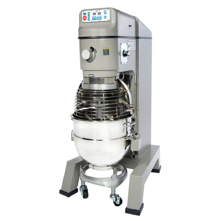 The Globe SP62P-41 (QUICK SHIP) Planetary Pizza Mixer Floor Model 4-speed (fixed) is a robust kitchen appliance designed for high-efficiency mixing in commercial environments. This mixer features a 60 qt. (57 liter) stainless steel bowl, ideal for handling large quantities of pizza dough. The unit is powered by a 3 HP motor with direct gear-driven technology, ensuring consistent performance and durability. Equipped with heat-treated hardened steel alloy gears and shafts, it provides reliable operation and longevity. The mixer includes a #12 attachment hub and comes with an aluminum spiral dough hook, flat beater, stainless steel whip, and an aluminum bowl truck, offering versatility for various mixing tasks. For safety and convenience, it features a safety interlocked 1/8 HP power bowl lift and a stainless steel removable bowl guard with a built-in ingredient chute. The front-mounted digital touchpad controls include a 60-minute digital timer with a last batch recall and auto-off function, enhancing operational efficiency. This mixer is built with a cast iron body and an enamel gray finish, supported by non-slip rubber feet for stability. It is NSF certified and cETLus listed, ensuring compliance with safety and sanitation standards. The Globe SP62P-41 is designed to ship within 1-2 days for prompt delivery.