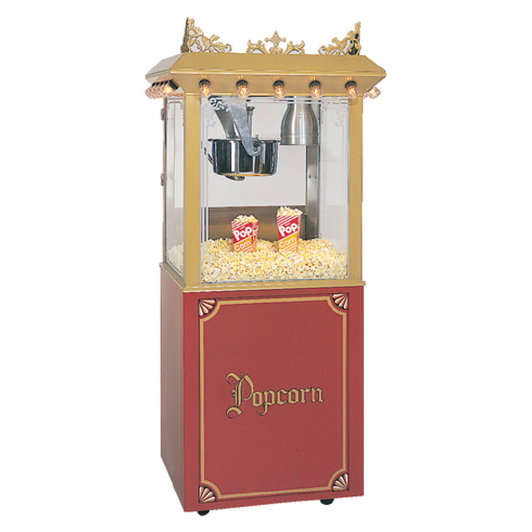 The Gold Medal 2120 Antique Citation Popcorn Machine Cabinet Red Base is a noteworthy piece in the world of popcorn machines, exuding a charming antique aesthetic while providing reliable performance. Distinguished by its striking red base, this model is crafted by Gold Medal Products, a trusted name in the industry. Although the original description does not specify dimensions or additional features, the classic appeal of its design suggests that it is built with both functionality and style in mind. This popcorn machine cabinet is poised to serve various market segments, from nostalgic-themed cinemas and theatres to vintage-style cafes and gourmet popcorn retailers. Its visually appealing design makes it an ideal centerpiece in any venue aiming to evoke a sense of nostalgia. The Antique Citation model likely integrates seamlessly into environments where both aesthetics and performance are paramount. It stands as a testament to Gold Medal's commitment to quality and design, offering a distinctive blend of tradition and utility. Perfect for businesses that prioritize unique customer experiences, this machine cabinet not only serves the basic function of popcorn production but also enhances the ambiance and visual appeal of its surroundings.