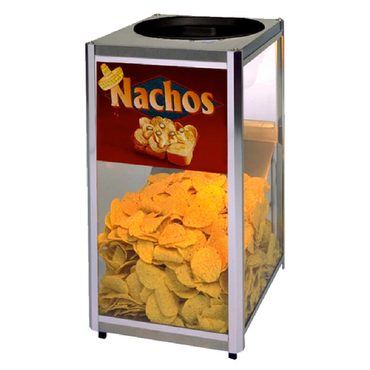The Gold Medal 2186ST Servalot Chip Warmer is engineered to efficiently hold and warm up to 10 pounds of chips, making it an essential asset for restaurants, concession stands, and catering services. This top-loading chip warmer is designed with a compact 12-inch form factor that provides a space-saving solution without compromising on capacity. Its yellow accent light adds a touch of visual appeal while enhancing the visibility of contents, making it an attractive choice for front-of-house operations. Constructed with a durable stainless steel top and bottom, it ensures long-lasting performance and reliability in high-traffic environments. The unit features plexiglass windows, allowing for clear visibility of the chips inside, which is perfect for self-service areas or busy kitchens. Operating at 61 watts and requiring a 120v/60/1-ph electrical connection, this chip warmer is energy-efficient and cost-effective. Additionally, it comes with a NEMA 5-15P plug, making it easy to integrate into existing setups. The Gold Medal 2186ST Servalot Chip Warmer is cULus and NSF certified, meeting strict safety and sanitation standards. Its combination of practical features and compliance with industry standards makes it an ideal choice for businesses aiming to deliver fresh, warm chips to their customers.