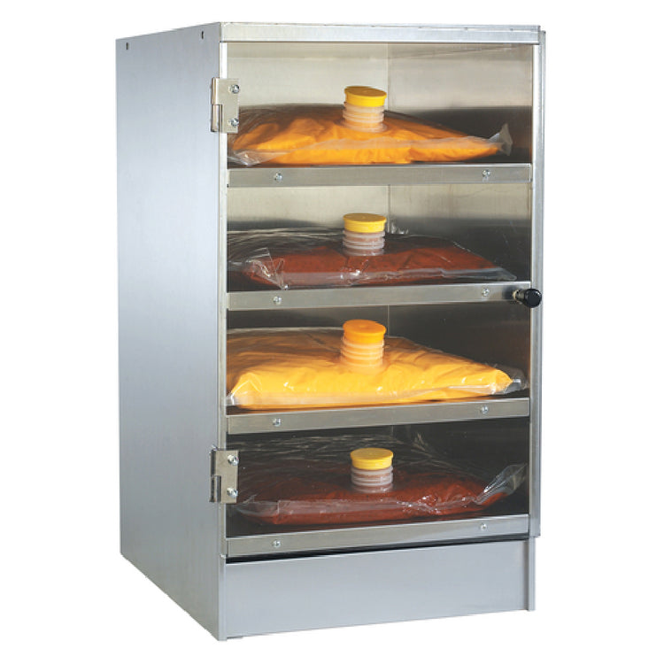 The Gold Medal 2264 Bag Cheese & Chili Pre-Warmer is a specialized appliance designed to accommodate (4) standard chili or cheese bags, making it an essential tool for food service establishments that require efficient warming solutions. This model features (4) heated shelves with adjustable temperature control, allowing users to customize heat settings for optimal results. Operating at 200 watts, this pre-warmer ensures consistent and reliable performance while maintaining energy efficiency. It requires a 120v/60/1-ph electrical connection and is equipped with a NEMA 5-15P plug, making it compatible with standard outlets. The Gold Medal 2264 pre-warmer is cULus certified, indicating compliance with rigorous safety standards, and NSF certified, ensuring it meets public health and sanitation requirements. This product is particularly valuable for concession stands, cinemas, and restaurants that serve hot cheese or chili in high volumes, providing a practical and efficient solution for keeping these items warm and ready to serve. The adjustability and certification of this pre-warmer underline its commitment to quality, safety, and functionality, offering a dependable choice for professionals in the food service industry who need to maintain the temperature of their cheese and chili products efficiently.