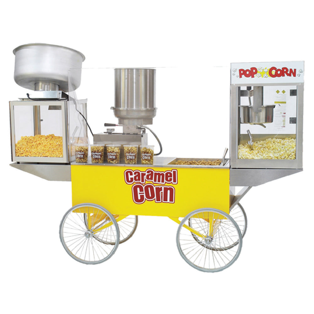 The Gold Medal 2618 Lobby Master Mini Three-in-One Merchandising Wagon is a versatile and compact solution for those in the food service industry, particularly catering to cinemas, amusement parks, and event venues. This merchandising wagon includes a display wagon design that effectively showcases its integrated components. Equipped with a built-in Karmel Kool system, it enhances caramel corn production, making it ideal for gourmet popcorn enthusiasts. The inclusion of the Karmel Baby® Cooker Mixer (#2626) facilitates precise and efficient cooking and mixing processes. Additionally, the 12/14-oz. PopMaxx Popper (#2552) ensures high-capacity popcorn production, perfect for high-traffic areas. The Cheddar Easy Shop Combo (#2346) adds further value by allowing for the easy integration of cheese-flavored popcorn options. Operating at 1782 watts and utilizing a 120v/60/1-ph power supply, this unit is equipped with a NEMA 5-15P plug, ensuring compatibility with standard electrical outlets. This versatile wagon meets safety and sanitation standards, being both cULus and UL EPH Classified. With its multifaceted capabilities and efficient design, the Gold Medal 2618 Lobby Master Mini Three-in-One Merchandising Wagon is a valuable asset for businesses looking to enhance their snack offerings and maximize their merchandising potential.