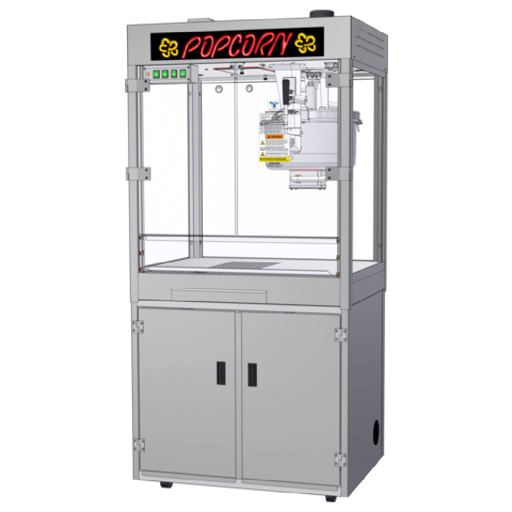 Gold Medal Products, 2668-00-801, Spartan 52 oz. Popcorn Popper with Base, electric, back counter, base cabinet with swivel casters, 52 oz. top hat kettle, electronic temperature control, LED backlit sign, LED cabinet lighting, heated corn deck, 3-stage filtration system, stainless steel cabinet and base construction, no oil capability, cETLus, ETL-Sanitation