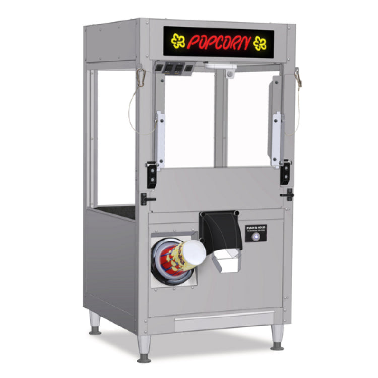 - Pushbutton activated convenience for easy popcorn dispensing