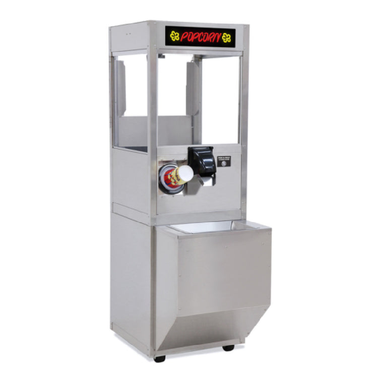 The Gold Medal 2784-00-050 ReadyServe® One Staging Cabinet & Self-Serve Dispenser With Base is an innovative solution designed for efficient popcorn service. Engineered with a front counter design, this unit integrates a popcorn crisping system that maintains the freshness and flavor of popcorn, making it ideal for concession stands and theaters aiming to provide top-quality snacks. The pushbutton-activated popcorn dispenser streamlines the serving process, enhancing customer experience and reducing wait times. An LED lighted sign ensures visibility and attraction in any setting, effectively drawing in customers with its illuminated appeal. The cabinet's integrated cup holder adds a convenient feature for easy access and organization, facilitating a seamless self-serve experience. Constructed with durable stainless steel, this dispenser is built to withstand the demands of high-traffic environments while ensuring longevity and ease of maintenance. Equipped with casters, the unit offers mobility, allowing operators to reposition it effortlessly as needed within any retail or entertainment space. The Gold Medal 2784-00-050 ReadyServe® model stands out as a versatile and robust solution for businesses seeking to enhance their popcorn service with a reliable, self-serve option that combines practicality with modern design elements.