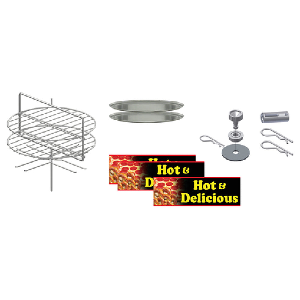 The Gold Medal 5553-004 Combo Cabinet Kit Large Rotisserie is a versatile and functional addition to any commercial kitchen environment, specifically engineered to cater to diverse culinary needs. This kit includes a large rotisserie that is expertly designed for even cooking, ensuring quality results each time. Accompanying the rotisserie are two 19-inch pizza pans, offering ample space for creating large, delectable pizzas with ease. The unit features large combo graphics, enhancing its aesthetic appeal and making it a standout piece in any setting. Compatible with cabinet models 5550-00 and 5550-01, this kit allows for seamless integration into existing setups, providing flexibility and compatibility. The Gold Medal 5553-004 is ideal for restaurants, cafes, and food service businesses seeking to expand their cooking capabilities with a reliable and efficient solution. Its robust design and compatibility features make it a preferred choice for culinary professionals aiming to optimize their kitchen operations. Whether used in a bustling restaurant or a cozy café, this combo cabinet kit is designed to support high-volume food preparation, making it a valuable asset in the food service industry.