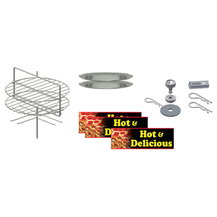 The Gold Medal 5553-005 Combo Cabinet Kit Small Rotisserie with (2) 15-inch Pizza Pans is a versatile and compact solution designed to meet the specific needs of food service operations that require efficient rotisserie and pizza preparation capabilities. This kit is compatible with cabinets 5551-00 and 5551-01, making it an adaptable choice for establishments already using these models. The small rotisserie function allows for the precise cooking of rotisserie items, while the inclusion of two 15-inch pizza pans expands its utility to pizza preparation, catering to a diverse range of culinary applications. The small combo graphics add a visual appeal that enhances the presentation of the unit. This product serves as a unique value proposition for various market segments by offering a space-saving design without compromising functionality, making it ideal for small to medium-sized food service environments looking to maximize their menu offerings. Its adaptability and compact size make it a practical choice for businesses aiming to enhance their kitchen's versatility and efficiency. With the Gold Medal 5553-005 Combo Cabinet Kit, operators can streamline their cooking processes, delivering high-quality rotisserie and pizza dishes to satisfy customer demands effectively.