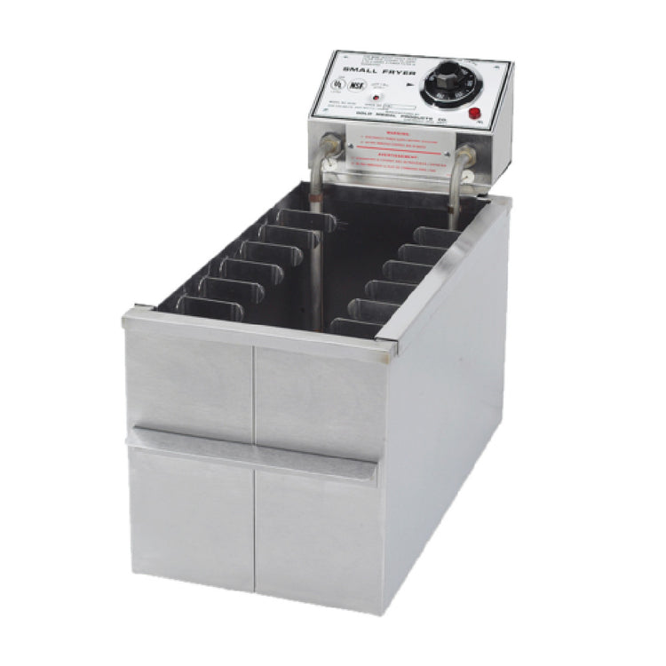 The Gold Medal 8048D Fryer Small Electric is a versatile kitchen appliance designed for efficient frying operations with a substantial oil capacity of 30 lbs. This compact fryer is electrically powered, featuring an impressive 3000-watt heating element that ensures rapid cooking and consistent results. It operates on 208/240 volts at 60 Hz, compatible with a NEMA 6-15P plug, making it suitable for various commercial kitchen setups. The fryer is equipped with (2) standard six-position clip assemblies, providing flexibility in frying different food items simultaneously. Safety is a priority with the inclusion of an emergency stop safety button, offering peace of mind during high-demand culinary tasks. The integrated drain valve facilitates easy maintenance and oil management, enhancing the user-friendly aspect of the fryer. Certified by both UL and NSF, the Gold Medal 8048D Fryer meets the necessary standards for safety and sanitation, making it a reliable choice for professional kitchens. Its compact size and efficient design cater to diverse market segments, from bustling restaurant kitchens to small-scale food service operations, where space and efficiency are crucial. This fryer is a robust and reliable piece of equipment that contributes significantly to the productivity of any culinary environment.