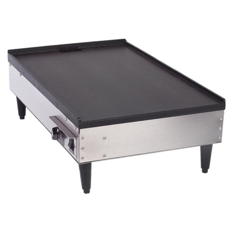 The Gold Medal 8200 Table Top Griddle is a highly efficient cooking appliance designed for professional kitchens and food service operations. This flat griddle features infinite control, allowing precise temperature adjustments to suit various cooking requirements, making it an essential tool for chefs aiming for perfection in their culinary creations. Powered at 1720 watts, this griddle operates on a 120v/60/1ph electrical system and is equipped with a NEMA 5-15P plug, ensuring compatibility with standard electrical outlets. The non-stick coated casting surface enhances its ease of use and maintenance by preventing food from sticking and facilitating quick clean-up processes. The Gold Medal 8200 is ideal for diverse market segments, including restaurants, catering services, and small food businesses, seeking a reliable, easy-to-use griddle that delivers consistent cooking results. Its table-top design offers a compact solution for spaces where counter space is at a premium while still delivering the robust performance expected in high-demand food service environments. By combining technological precision with practical design, the Gold Medal 8200 Table Top Griddle stands out as a versatile and valuable asset for any professional kitchen setup.