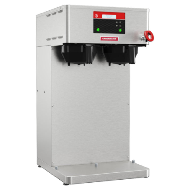 The Grindmaster Cecilware B-DGP-240V GRINDMASTER Beverage (LV606083) PrecisionBrew® TWIN Gravity Pot Coffee Brewer is a highly versatile and technologically advanced coffee brewing solution designed for a variety of professional settings, from bustling cafes to corporate offices. This double brewer supports two 84-ounce thermal gravity containers, which are sold separately, making it suitable for high-volume environments. It features digital controls that allow for precise customization, including programmable pulse brewing and pre-infusion options to enhance the coffee's flavor profile. The brewer's sleep mode ensures energy efficiency when not in active use. Constructed with durable stainless steel, this coffee brewer is built for longevity and ease of maintenance. The inclusion of a hot water faucet adds to its functionality, making it a multi-purpose asset in any beverage service operation. With a power specification of 240 volts, it operates at 6025 watts and 15 amps, compatible with a NEMA L6-30 plug. The appliance is certified by UL and NSF, affirming its compliance with safety and sanitation standards. For businesses seeking a reliable, high-capacity coffee brewing machine, the Grindmaster Cecilware PrecisionBrew® TWIN Gravity Pot Coffee Brewer stands out with its blend of advanced features and robust construction.