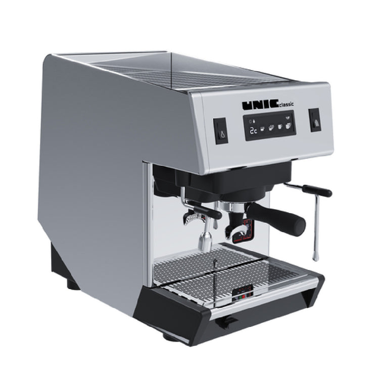 The Grindmaster Cecilware CLASSIC 1 GRINDMASTER Beverage (LV602645) UNIC Classic Series Espresso Machine is engineered for efficiency and versatility, catering to the demands of cafes and restaurants. This automatic espresso machine is equipped with a single group head and a 6.3-liter steam boiler, facilitating the preparation of 50-100 drinks daily, making it an optimal choice for medium-sized establishments. Its direct-to-boiler mounted group head allows for simultaneous brewing of two espressos, enhancing productivity. The machine comes with a single, double, and blank portafilter, offering flexibility in espresso extraction. It boasts pump and steam pressure gauges, coupled with four programmable volume keys and a semi-automatic key for manual control, providing precision in every brew. The stainless steel steam arm and hot water dispenser add to its functional design, while an integrated shot timer ensures accurate brewing times. A built-in cup warmer maintains cup temperatures, and a full-sized rotary vane pump delivers consistent pressure. Operating at 1.7 kW on a 110v/60/1-ph power supply, it requires 20 amps. The CLASSIC 1 machine is both cETLus and ETL-Sanitation certified, ensuring compliance with stringent standards, making it a valuable asset for any specialty coffee operation.