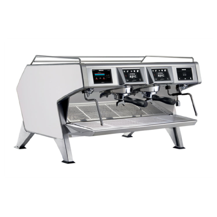 The Grindmaster Cecilware EPIC 2 WHITE GRINDMASTER Beverage - (LV602955) UNIC Epic Espresso Machine is a cutting-edge appliance designed for high-efficiency coffee service environments. This automatic espresso machine features two groups and a substantial 8.9-liter hot water and boiler capacity, catering to establishments requiring consistent and rapid beverage production. It is equipped with a central control LCD touch screen, facilitating intuitive operation and precise control. The machine integrates two independent control boxes, each with four programmable dosing programs, enabling customization for diverse coffee preferences. Advanced thermalink network technology enhances operational efficiency, while the programmable pre-infusion time per group ensures optimal coffee extraction. The steamglide feature adds to the machine's versatility, providing smooth steam functionality. For ease of maintenance, the machine includes an automatic cleaning cycle and an easylock brew group. The white side and rear panels, combined with a stainless steel construction, offer a sleek and durable aesthetic. With a power output of 6.5 kW and operating at 220v/60/1-ph, this espresso machine is CE, UL, and NSF certified, ensuring compliance with international safety and quality standards. The Grindmaster Cecilware EPIC 2 WHITE is ideal for cafes, restaurants, and hospitality venues seeking reliable and sophisticated coffee solutions.