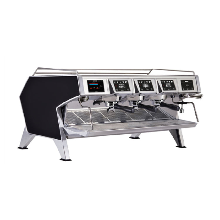The Grindmaster Cecilware EPIC 3 BLACK GRINDMASTER Beverage (LV602958) UNIC Epic Espresso Machine is a sophisticated, high-performance machine designed for professional use in the coffee industry. This automatic espresso machine features three groups, allowing for simultaneous brewing, enhancing efficiency in high-demand settings. It boasts a substantial 14.3-liter hot water and boiler capacity, ensuring a consistent supply of hot water for continuous operation. The machine is equipped with a central control LCD touch screen, providing intuitive operation and management of the brewing process. Each of the three independent control boxes offers four programmable dosing programs, allowing for precise customization of espresso shots tailored to different tastes and preferences. The inclusion of a thermalink network and programmable pre-infusion time per group further optimizes the brewing process, ensuring exceptional quality in every cup. Additionally, the Steamglide function enhances milk frothing, while the automatic cleaning cycle simplifies maintenance. The easylock brew group aids in the seamless operation of the machine. With its sleek black side and rear panels and durable stainless steel construction, this machine operates on a powerful 6.5 kW, 220v/60/1-ph electrical supply. It is CE, UL, and NSF certified, underscoring its adherence to international safety and quality standards.