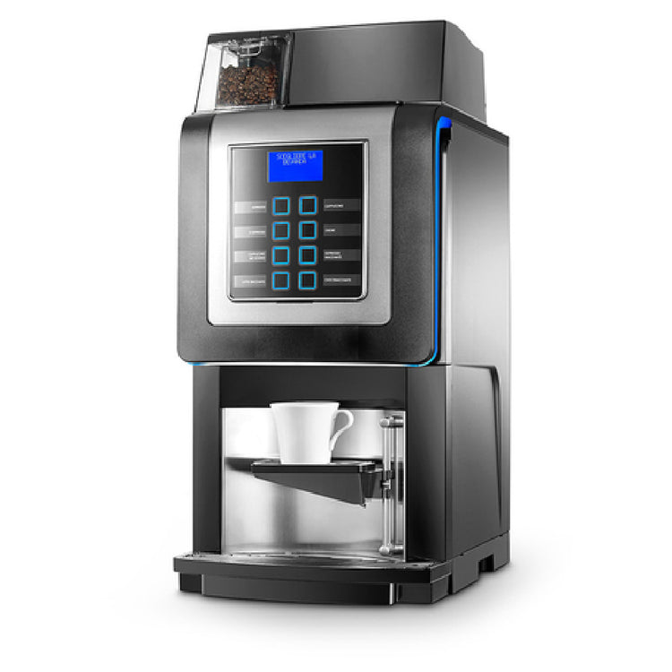 The Grindmaster Cecilware KORINTO PRIME GRINDMASTER Korinto Prime Espresso Machine is a high-performance, super-automatic espresso machine designed to meet the demands of various market segments within the coffee industry. This machine features a 2.1 lb. coffee bean hopper, alongside two soluble hoppers, allowing for versatile beverage options. With a 0.6-liter boiler, it efficiently produces up to 80 espressos per hour, making it suitable for high-traffic environments. The machine offers three dispense volumes, catering to different serving sizes and preferences. A graphic display with a touch-sensitive selection panel enhances user interaction, streamlining the beverage selection process. Operating at 1.4kW and requiring a 120v/60/1-ph electrical connection with a 12 amp draw, it comes equipped with a cord featuring a NEMA 5-15P plug. The Grindmaster Korinto Prime is both UL and NSF certified, ensuring compliance with safety and sanitation standards. This espresso machine is an optimal choice for businesses seeking a reliable and efficient solution to their coffee service needs, combining advanced technology with user-friendly features to deliver consistent quality and performance.